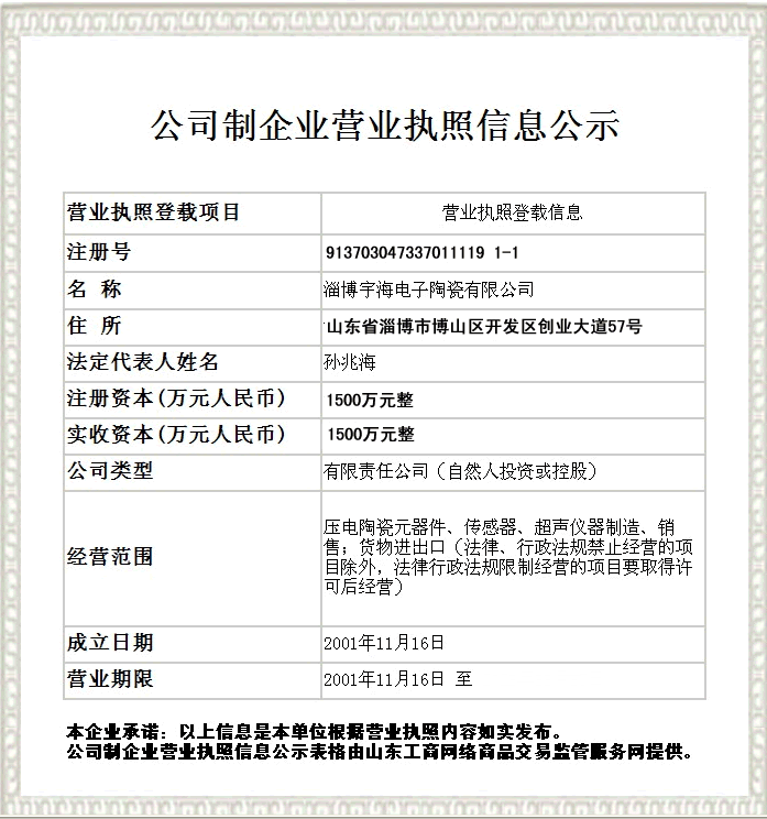 淄博宇海電子陶瓷有限公司位于淄博市博山開發(fā)區(qū)創(chuàng)業(yè)大道57號(hào),始建于1966年,2001年11月由國(guó)營(yíng)淄博無線電瓷件廠改制為淄博宇海電子陶瓷有限公司。公司是生產(chǎn)壓電陶瓷元件的專業(yè)廠家,是中國(guó)電子元件行業(yè)協(xié)會(huì)創(chuàng)始會(huì)員、山東省先進(jìn)陶瓷創(chuàng)新創(chuàng)業(yè)共同體理事單位。
